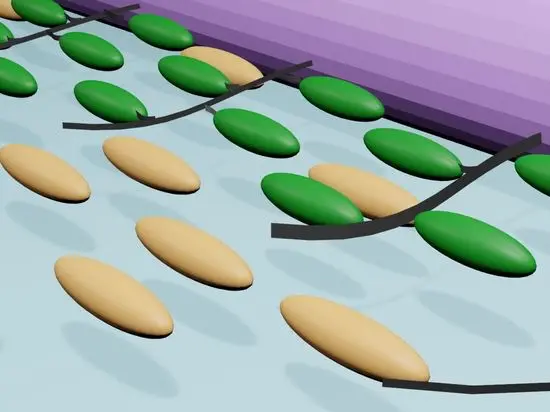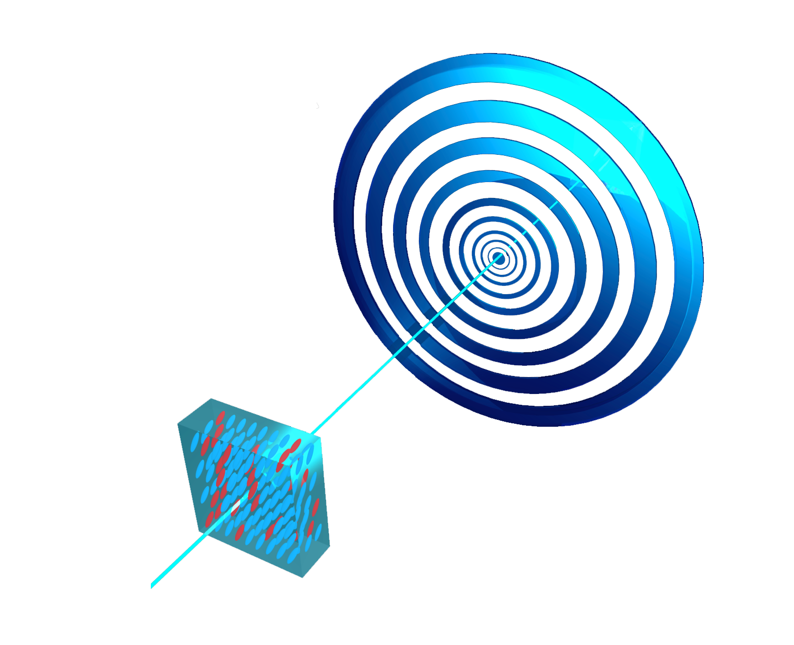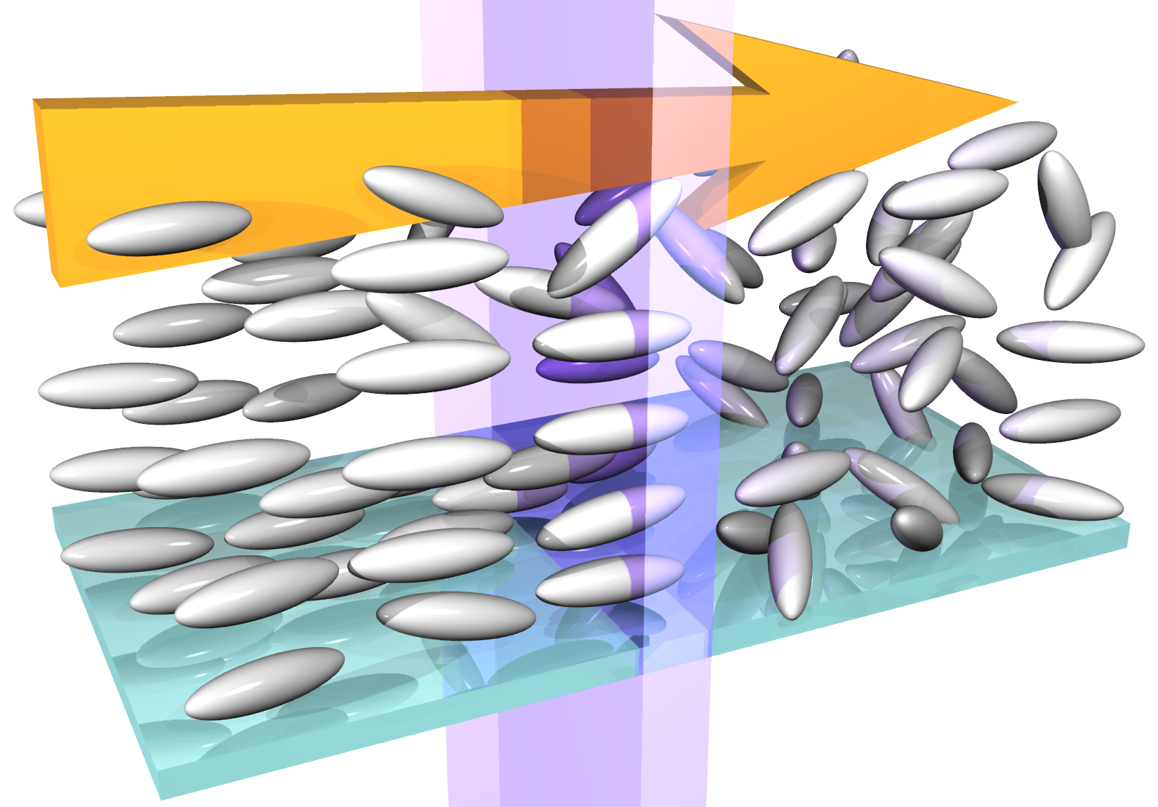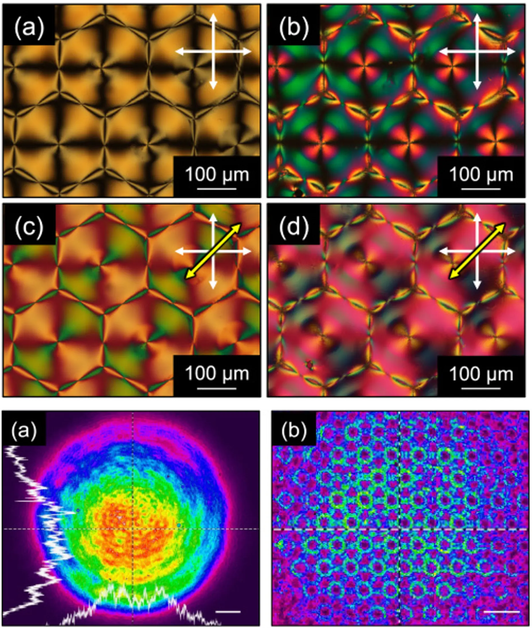 高機能性フィルム創製のためには,液晶をはじめとする機能性分子の精緻な配向制御が大変重要となります。 分子配向制御には偏光照射や分子配向膜が多く用いられており,これらに加えて新たな原理に基づく分子配向法の開発をしました。 空間的な強度分布を有する非偏光を用いた光重合により,簡便なプロセスで一軸分子配向や二次元分子配向パターンが誘起できることを見出しています。
