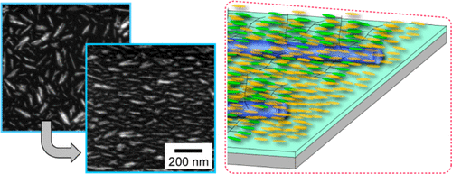 金属や半導体などをナノスケール化すると,バルク状態とは異なる物性を示すことが知られています。 特にナノロッドやナノワイヤーは,形状に由来する異方的な機能を発現する可能性を秘めたナノ材料です。 わたしたちは,組織化能を有する液晶物質と密接に接合させることで,ナノ材料の配向を制御し得ることを見出してきました。 ソフトマテリアルの分子配向制御に基づき所望の三次元配向構を構成する異方性ナノ材料を開発し,ナノロッドやナノワイヤーの本質的な物性を明らかにするとともに, 多彩な機能材料へ展開することを目指しています。 さらに,設計に基づく精緻な微細造形を特徴とするトップダウン型の半導体加工(リソグラフィ)技術を, ナノメートルスケールの組織構造を自発形成するソフトマテリアルの組織化を駆使し,両者を融合することによって初めて発現する新規ナノ構造形成と機能材料創成を目指します。