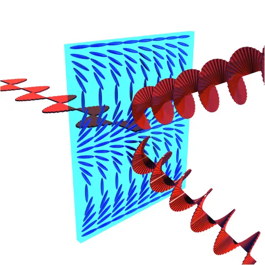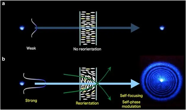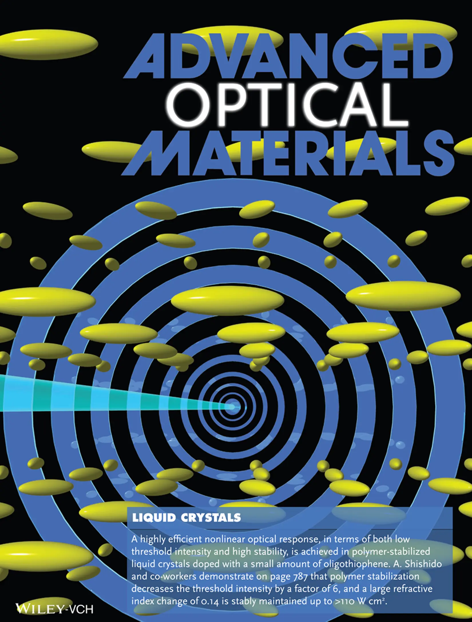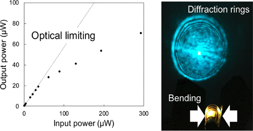 新しい光機能性材料の創製に向けて,光と分子の相互作用に注目が集まっています。 オリゴチオフェンを少量ドープした液晶を高分子安定化することにより,ホスト液晶の光分子配向変化を効率良く誘起することができます。 この配向変化プロセスは非線形光学効果を作動原理としており,光強度を認識して減光挙動を示す新たな光学デバイスが実現します。